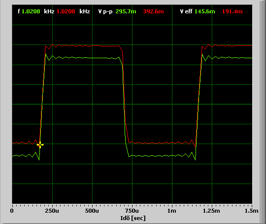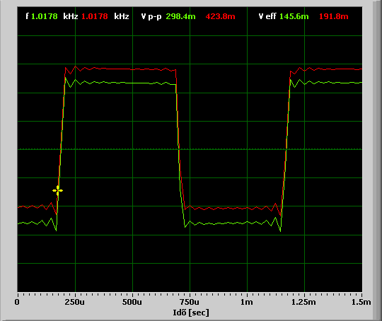 Az 1. képen a zöld jel a korábban már említett előtétemmel és mérőfejjel mért 1 kHz-es négyszögjel. A piros egy soros 150kOhmos ellenállás és egy soros 1µF-os kondi ugyanerre az 1kHz-es jelre kötve, 50mV-tal feljebb tolva. A két jel szinte azonos, tehát az előtét nem sokat változtat a jelen. A 2. képen egy sima vékony "bányász" dróttal kötöttem be a jelet a hangkártyába. Látható, hogy ez a jel is azonos, tehát az RCA-jack kábel se szól bele a jelbe. A 3. képen a 150k-val párhuzamosan kötöttem egy 100pF-os kondit. Ez csak ront a helyzeten. Csökkentve a kapacitás az eredeti képhez jutottam, tehát ebben a felállásban nem segít a kompenzálás csak ront. A 4. képen egy 470pF-os kondival a 150k utáni osztott jelet a földre kötöttem. Ez erős csillapítás. Egy kicsit lekanyarította a jel sarkait. Az 5. képen ugyanilyen bekötéssel egy 100pF-os kondi van. Itt mintha jobb lenne ezzel a csillapítással, de a szkópon ténylegesen ugráló csúcsok miatt ez nem nagyon látszik.