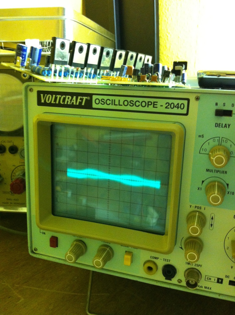 Új végtranyók, Új 0,33 ellenállások, védő ellenállással indítva ez látható a kimeneten, semmi nem melegszik. A kimeneten sustorgó hang hallatszik nem süket mint eddig.