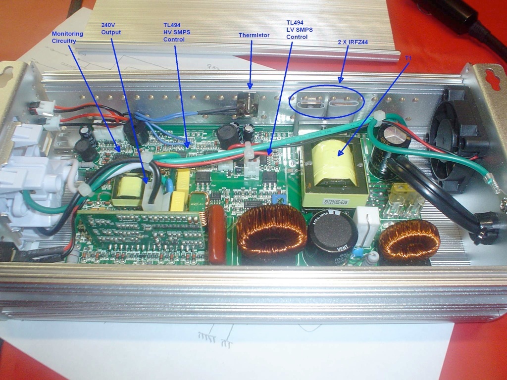 Miért kell fojtó a kimenetre? Láttam már ilyet (gyárit) abban sincs. A híd vezérlése megcsinálja a DC-ből a kvázi szinuszt vagy amilyet akarsz, és egy NTC-n keresztül megy a kimenetre, nem kell hozzá semmi más. Ebben sincs: