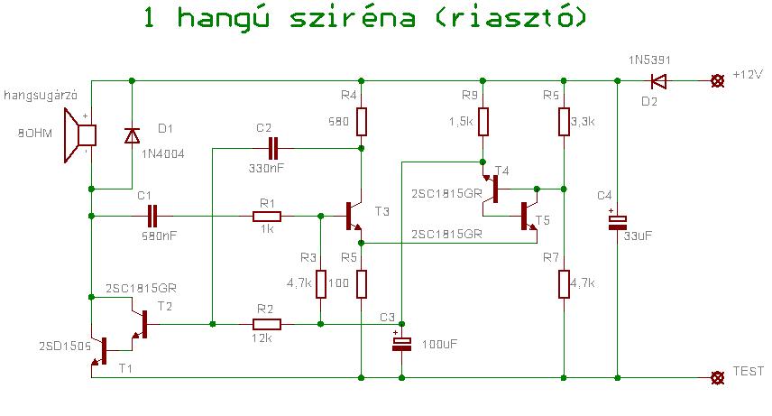 Korábban kísérletezgettem hasonló elgondolással, csak a szűretlen (akkor még!) táp miatt a hang inkább hasonlított egy jóképességű motorcsónak-motor hangjára, mint szirénáéra, és letettem róla. De lehet, hogy ha lesz egy kis időm, meg kedvem, nekilátok ismét, és megbütykölöm. (Igaz, itt a 2 hangmagasság váltakozású szirénák jöhetnek csak szóba, de az sem elhanyagolható.) A végére meg lehet tenni egy kis erősítőt, ami felnyomja tisztességes hangerőre a hangot.
