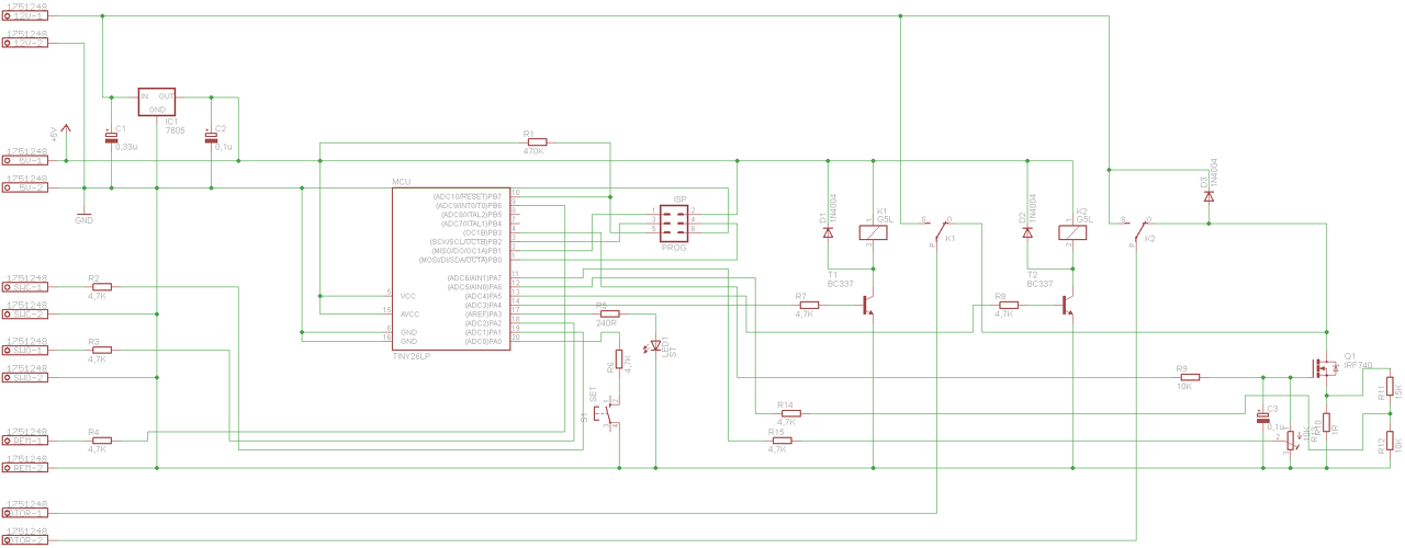 Publicitás: mikrokontrolleres a vezérlés, tehát a rajz egymagában "úgy is kevés". Másrészt még tanulom az elektronikát, lehetnek rajta hibák, amik sosem derülnek ki (vagy csak későn) ha nem osztom meg veletek. Kérésre az AVR forrását is megosztom, nem megélni szeretnék belőle, hanem csak megépíteni.