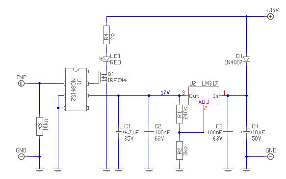 Hello! Itt a kapcsolás, R4 helyére trimmert teszel, lehet állítgatni. De leginkább 12V a megfelelő. Ha csak egy-két Led lesz benne, akkor az 555 is meghajtja. Ha egy kazallal, akkor kel bele a Fet.