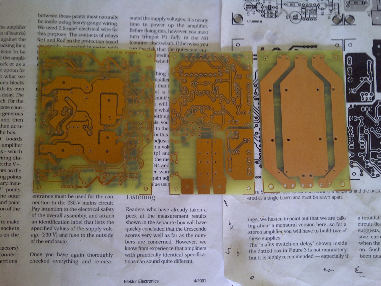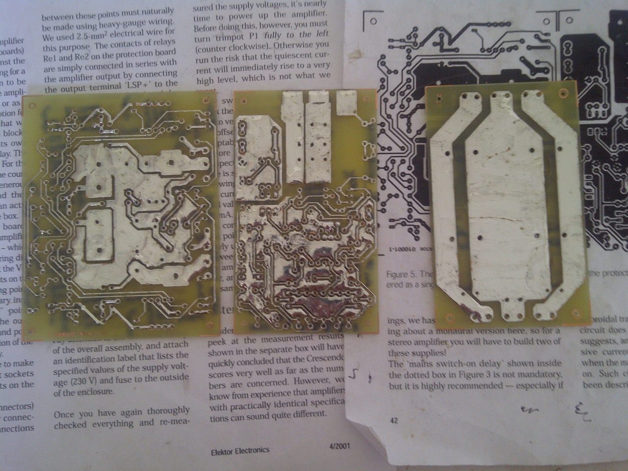 Igazából, ha mindent figyelmesen beültetsz, sok brobléma nem lesz. Engem is a panelok szivattak meg vékony vezetősávok hajszál vékony szakadásai. A panelra figyelj nagyon! Jó minőségű fóliát kell készíteni, az enyém sajna nem volt tökéletes, relop segített nekem is megoldani a problámát. Indításkor a potit teljesen balra csavard (óra mutató járásával ellentétes irányba ). Izzót és ellenállásokat ( 10 ohm 0.6W ) a plusz és a minusz ágba használj, főleg az eredeti Fet-el való indításkor, mert piszkosul drágák. Az Elektoros panelnál 0.8-as fúrót használj max, pár lábnak kell csak nagyobb. Nagy bordát használj mert piszkosul melegszik, 60W az alapfogyasztása a sztereónak. Amit látsz a képeken 19x10x5cm és 40-45fok az alap hőmérséklet, 4ohmra nem lenne elég. Kérdésed lesz csak írj, amiben tudok segítek.