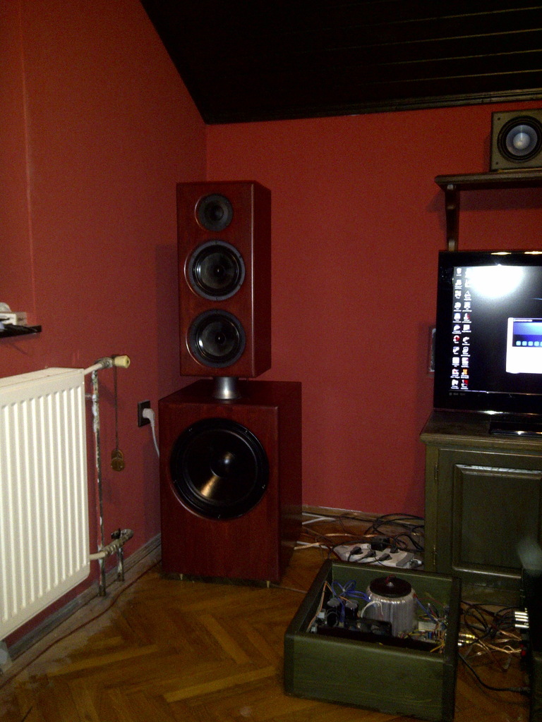 A hangfalban 30cm-es Visaton, 2x18cm Wharfedale, a magas egy piszkos drága monacor.