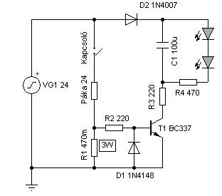 - Az R2 védi a bázist a túláramtól, a D1 ugyan ezt a fordított feszültségtől, az R3 a kollektort a túláramtó, a D2 a kollektor helyes polaritású feszültségét adja. R4 pedig a Led-ek előtét ellenállása. C1 azért kell, hogy a félhullámú jeltől ne villogjon a Led.