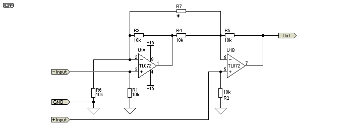 Az alábbi jel aszimmetrizálót építeném be az erősítőmbe, de a szimmetrikus 0,775V-os jelet 4V-ra erősíti fel. Hogy lehetne ezt az erősítést minimalizálni? Az R7 helyén 10k ellenállás van jelenleg. Így számomra használhatatlan a nagy jelszint miatt.