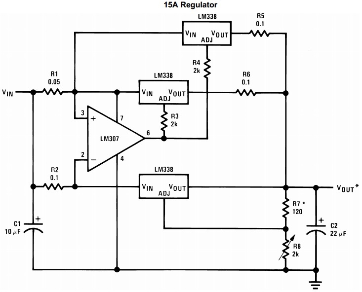Használj egyetlen LM338-as stabilizátor IC-t, mert ez önmagában is képes 5A szabályzására.
