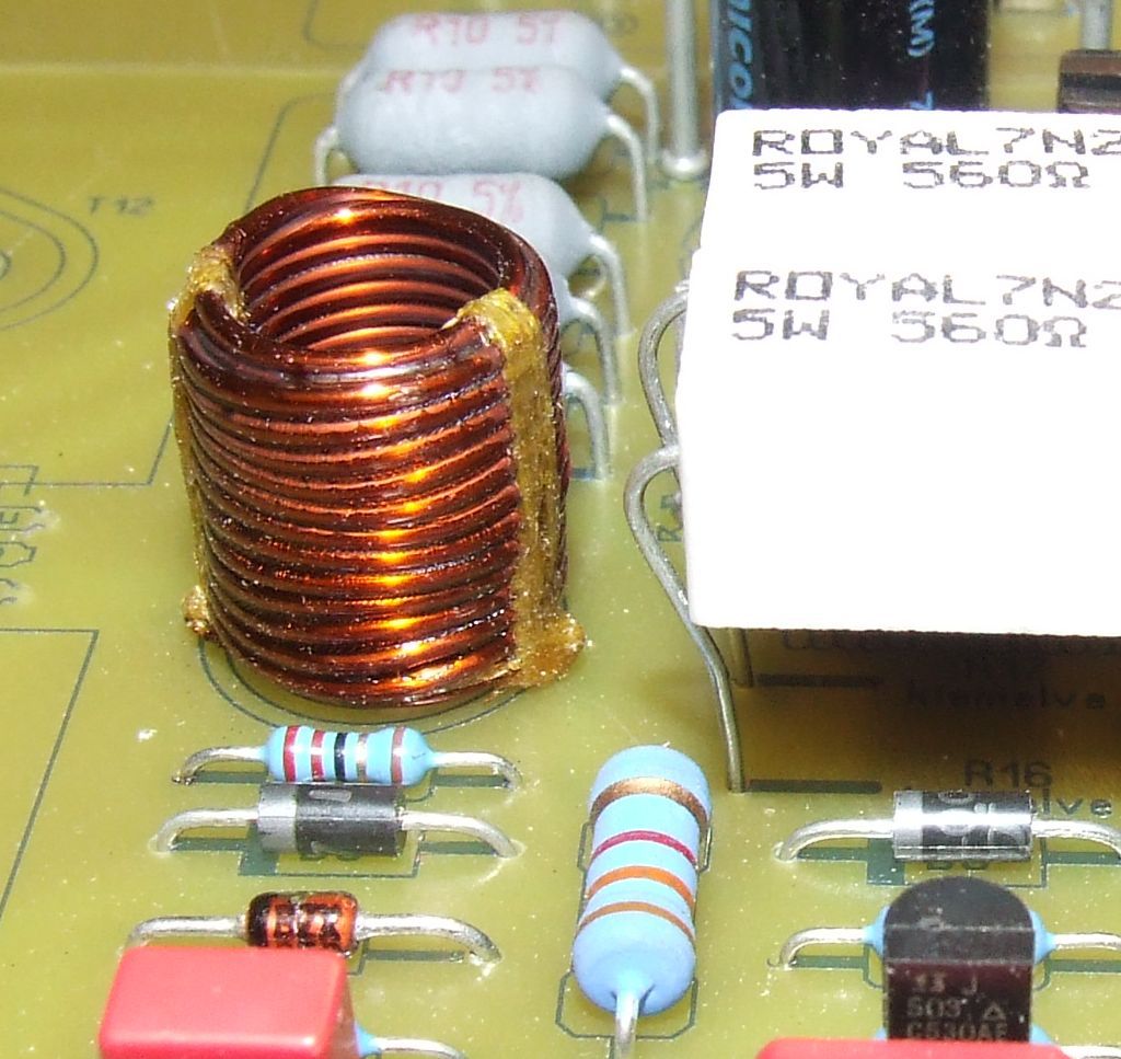 Induktivitások. Van itthon egy pár darab rossz PC alaplapom. Lebontottam róluk az induktivitásokat így kinyerve belőlük a ferrit rudat az első próbálkozáshoz. A rúd mérete: átmérő 5mm, hossz 20mm. Pont jó az 1,5 és a 2 uH induktivitások elkészítéséhez. Bár azt olvastam, az ideális rúd 6x20mm lenne. Nekem a bontott is megfelel így hirtelenjében, és kíváncsi is voltam rá lehet e velük valamit is kezdeni. Rézhuzalnak 1 mm átmérőt használtam, ilyet találtam hirtelenjében. Azt nem tudom, hogy rézhuzal és rézhuzal közt lesz-e különbség, de kipróbálom majd azt is. Van itthon Monacor légmagos induktivitásom majd szétbontok egyet arra a célra. Az könnyebben hajlítható, mint ez, amit hirtelen találtam. Szóval elsőre sikerült egy megközelítőleges 1,5 uH induktivitást készítenem, amihez 10 menetet kellet a ferritrúdra tekernem. Bár még finomítani kell a menetszámon, mert egy kicsit laza a tekercs és hosszú a kivezetése. Meg a zsugorcső is módosít rajta egy picit. Készítettem egy 1,5uH légmagos tekercset is, szintén az említett 1mm réz huzalból. Itt 27 menet lett egy 10 mm átmérőjű sablonra tekerve. Ez is laza lett, de próbálkozásnak kísérletezgetésnek jó volt.