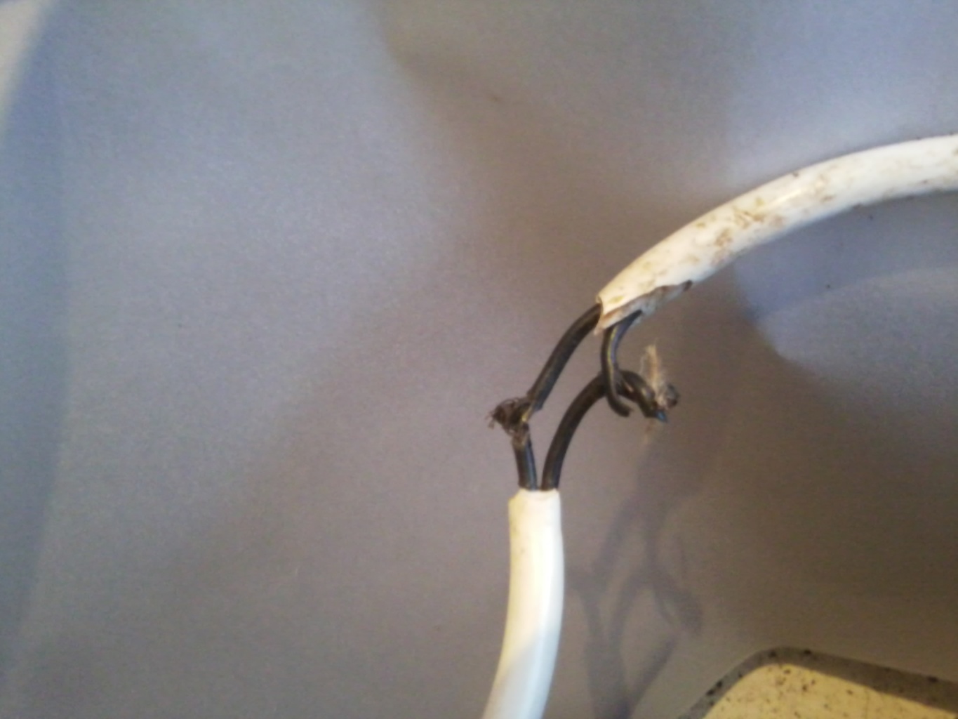 Majdnem dobtam egy hátast. Hogy van valakinek ennyi esze, hogy így oldja meg? Legalább tett volna rá szigetelőszalagot! Annyi esze volt, hogy nem egyforma hosszúra vágta.