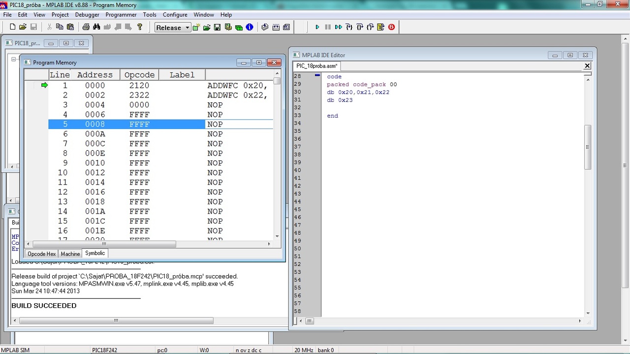 18-as PIC-nél egy-egy programmemória rekesz MINDIG páros számon kezdődik ( 2 byte-os egységeket alkotva!) ! Nem tudok úgy adatokat belerakni, hogy nem töltöm fel mind a két byte-ot, mindig lesz ott valami a másik byte-on is ( legfeljebb 0 ! ) ! Ezért nem értem, hogy mire mondod, hogy bezzeg a C meg tudja oldani és ezért kértem, hogy mutasd meg ( pl. kép! )!