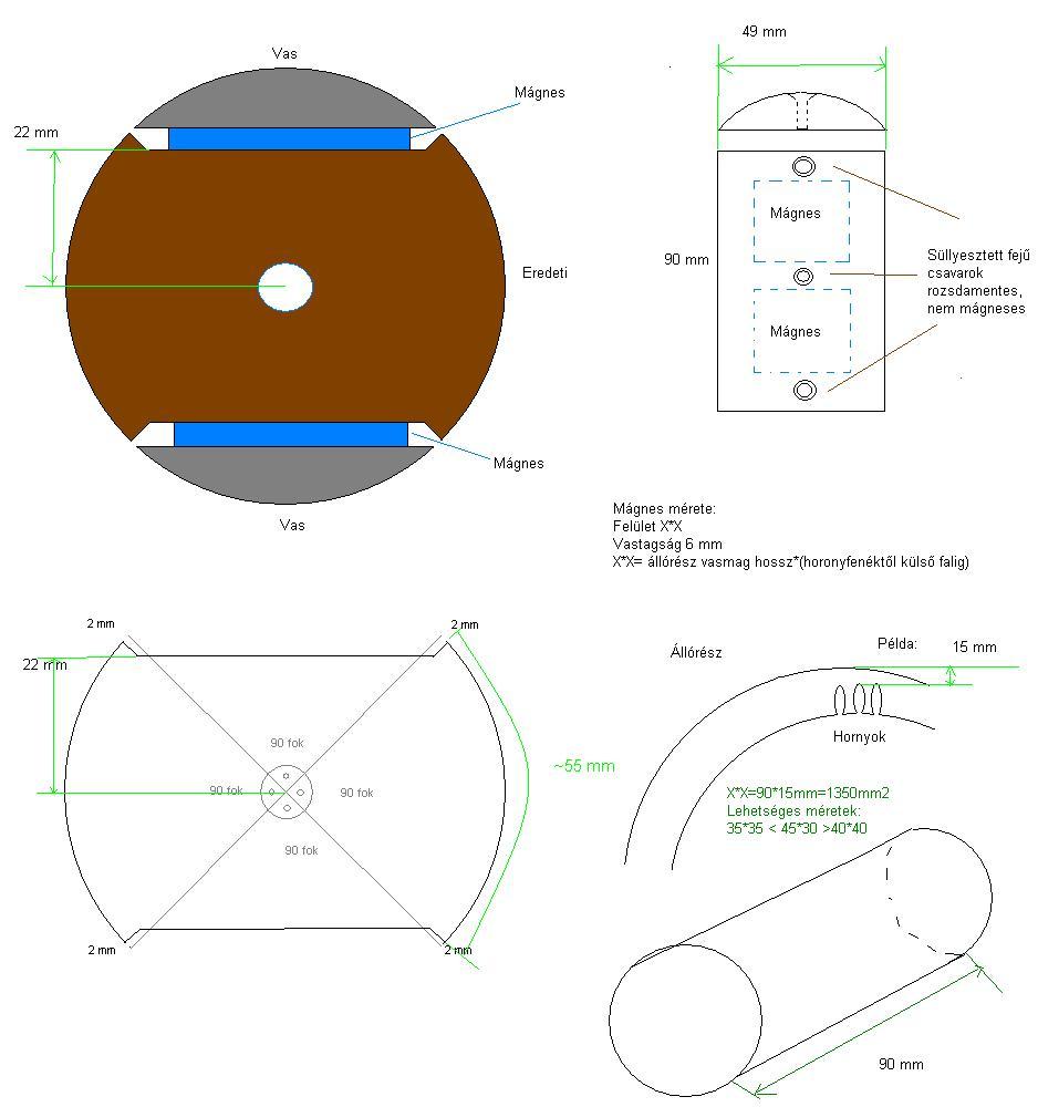 Ma este készítettem egy újabb átalakítási vázlatot a te ötlededet követve. A felkérés 4 pólusú motorról szólt, de értelemszerűen bármilyen pólusszámra átrajzolható. A példamotor 0,75-1kW-os lehet, ehhez forrás függvényében 9000-3000.-Ft a beépítendő mágnes. !!!