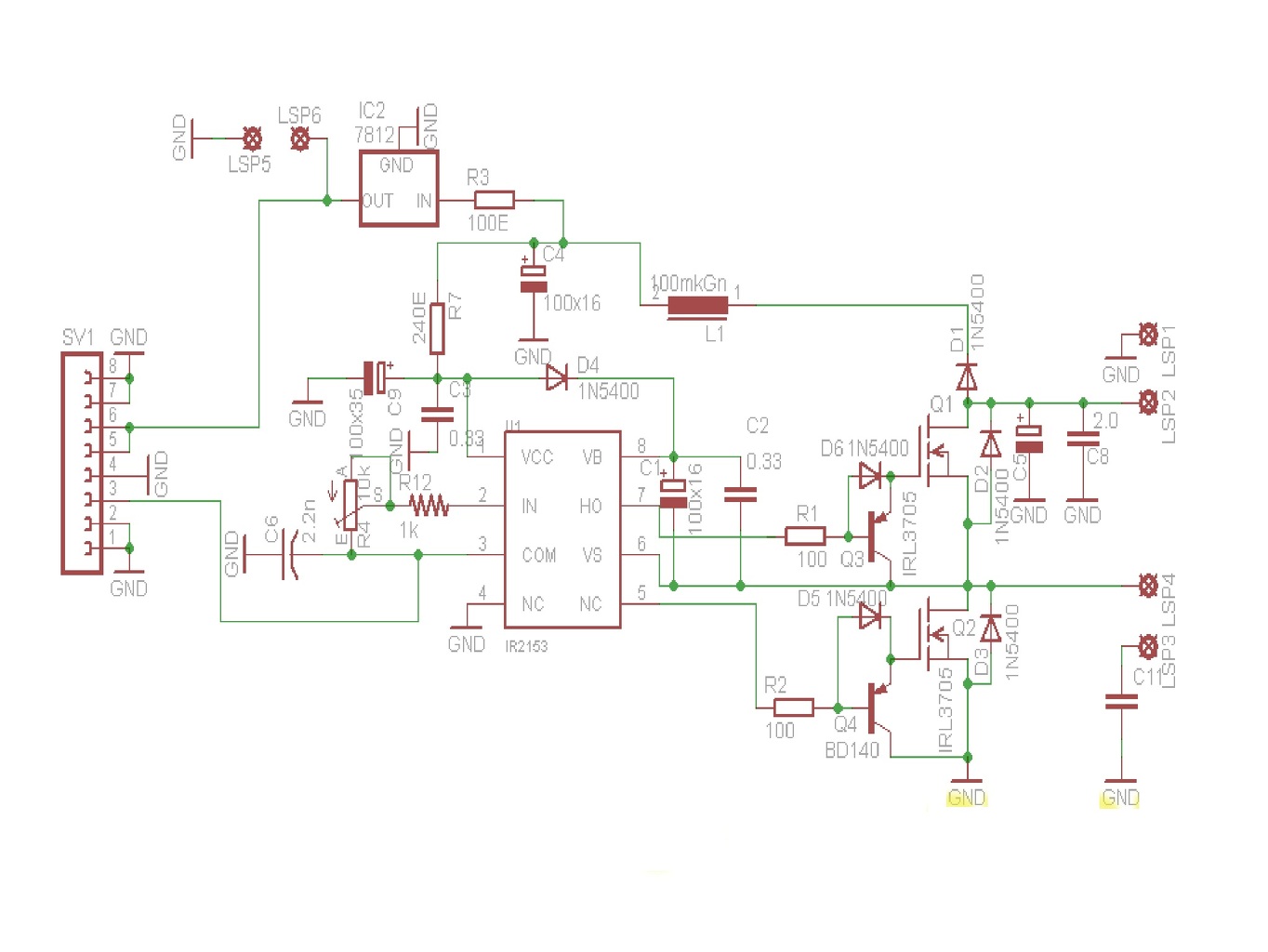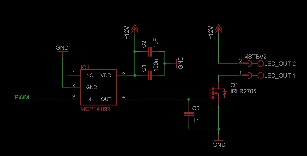 Nos a mellékelt rajzott készítettem, remélem így már működőképes lesz a dolog. Sajnos az MCP1416 és MCP1416R között nem volt egyértelmű a különbség, ezért én az 'R' jelzésűt használtam, mivel azt linkelted be, gondolom nem véletlenül.