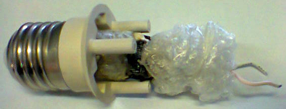 A minap egy ledes 230V-os égőt szedtem szét. Igen meglepődtem a belsején, a harmadik képen látható, hogy az elektronikát becsomagolták buborékfóliába ami szépen megolvadt. csak azért nem gyulladt ki mert idejében lekapcsolták. A negyedik képen látható ahogy valami fetet vagy hasonló dolgot gondosan hővezető pasztával bekenve, hozzányomták egy elkó végéhez.