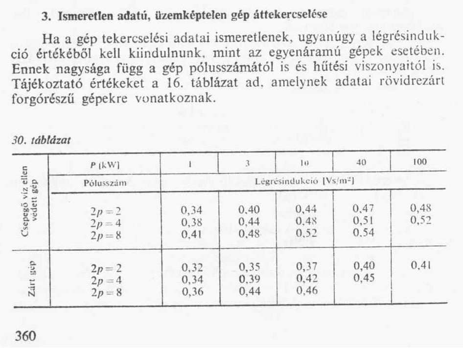 Szerintem is a légrésindukció az, ami erősen befolyásol mindent.A kb. 1.5 Tesla is csak a fogaknál jelentekzik .A motoroknál a legrosszabb (telítésveszélyes) a 2 pólusú elrendezés.Ekkor telíődhet a vasmag. Nemrég egy ismeretlen vasmagra számoltam ki az általad említett könyv alapján 3fázisú frekvenciaváltóra motort, és teljesen jó lett. Tehát 0.38Tesla az, ami a légrés miatt adódik.Egyébként a voltonkénti menetszám,szinte a transzformátorokéval azonos 4,44*B*A*F ahol az A a mágnespólus szélessége szorozva vastest hosszának szorzatával méterben, B= tesla , F az adott frekvencia.A tapasztalat szerint , mint soros mágneses gerjesztés a légrés értékével kell számolni, az ismeretlen motorhoz tartozó képlet is ezt mondja, én is így gondolom. üdv. Foxi