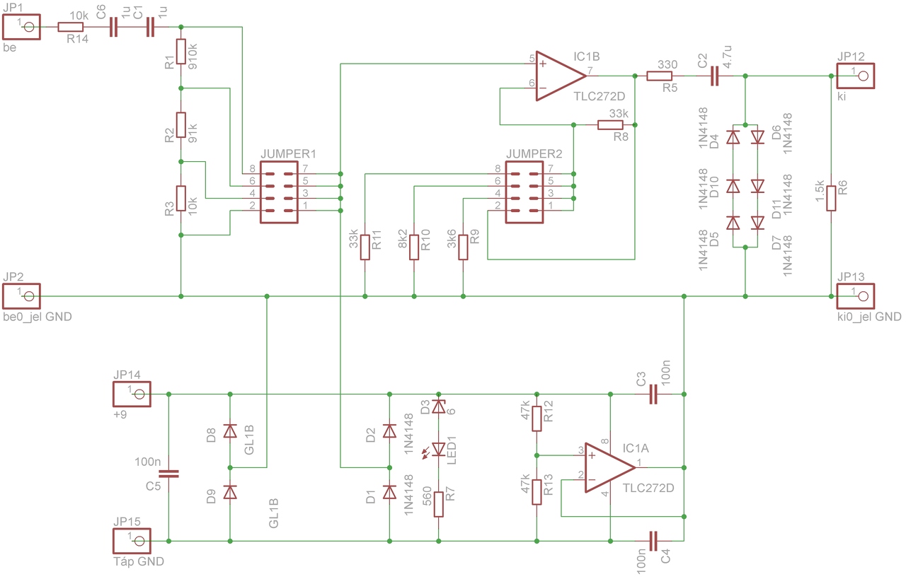 A Jel részében van az erősítő, és az végső diódás védelem. Az osztó részében a bemenet a soros ellenállással és kondikkal, valamint az osztó és szorzó jumperek vannak az ellenállásokkal. A táplálás részben van a 9V-os táplálás, virtuális földbeállítás, és a BEMENETI VÉDELEM IS! Ezeket a lapokat rövid vezetékekkel kötöm össze. Elhelyezés 80x40x20 dobozban(ebben az elem is benne van). Valaki átnézhetné a összeállítás kapcs raját, hogy jól bontottam-e szét az eredeti kapcsolást.