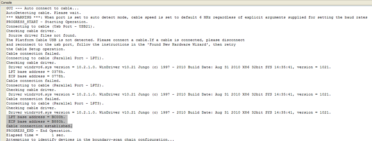 Az eszköz képet, a JTAG 2 lábával, akkor dobja be, amikor a .jed file-t bekattintom. (ha jól emlékszem) A kütyüt lecsekkolom. Mivel színes kanócok jönnek az LPT csati felől, kevés a valószínűsége, hogy elkötöttem, de az ördög nem alszik. Még a tesztek előtt tápot, táp visszajelzést, szinteket, JTAG felé ohmosan, JTAG - Xilinx lábakat, lecsekkoltam. Ami kimaradt: printer port felől még a hc125-öt, szintekkel kipróbálom. Az LPT portot valahogy letesztelem. Remélem nem az XP fogja valahogy.(biosbol mind a 4 féle beállítást kipróbáltam !) Üdv.: Sanyi