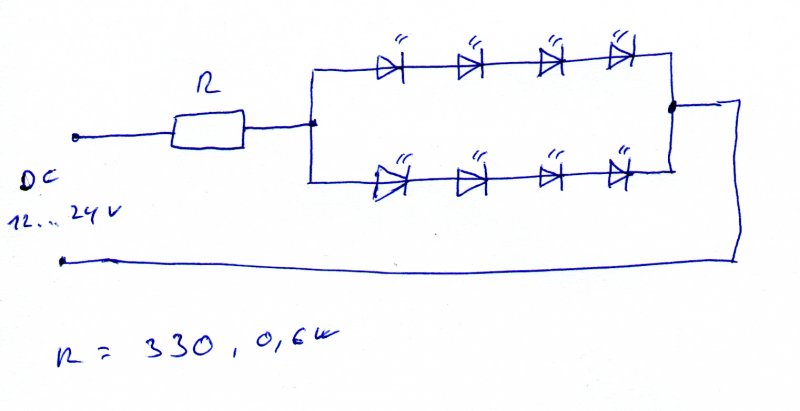 -A 2 sornál külön-külön tenném az előtétellenállást (670-670 ohm) -a ledeken eső feszültséget megmérném, s úgy alakítanám ki a 2 sort, hogy a ledeken eső feszültség mindkét sorban azonos legyen. -a led válogatásra azt is megteheted -ha nincs műszer-, hogy sorbakötöd a 8 db ledet, s különböző előtétellenállásokat téve -20mA fölé ne menjen az áram- megkeresed a bűnös led(ke)et, s kicseréled. Ha egyformák lennének, akkor minden áramerősségen ugyanolyan fényerővel kellene világítaniuk.