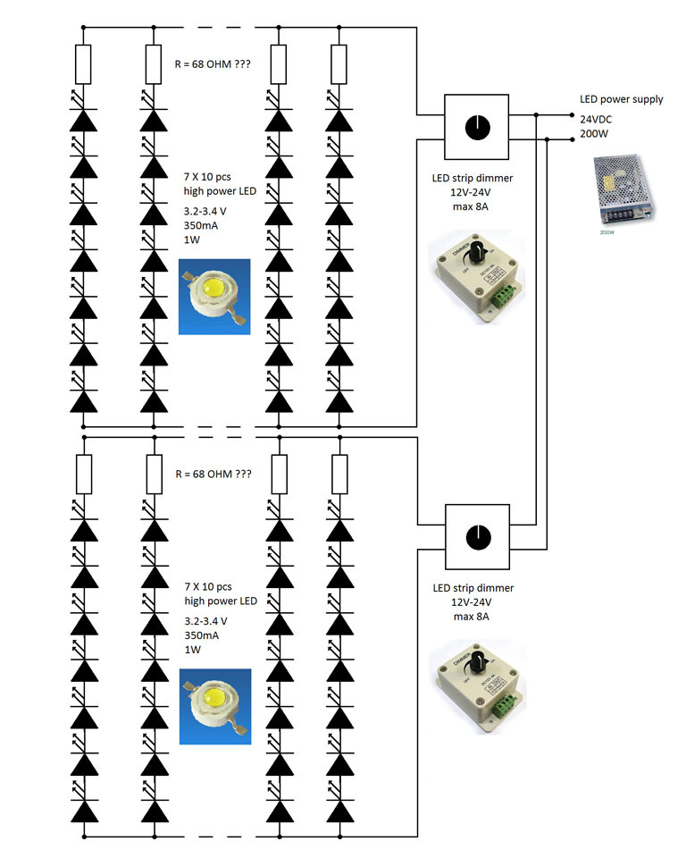 Elektronikában nem igazán vagyok járatos. Párszor már építettem ezt-azt LED szalagokból, a jövőben viszont egy 24V-os tápegységből és LED szalagokhoz használt dimmerekből akarok olyan áramkört építeni, amiben LED szalag helyett 1W-os LED-ek vannak. Lerajzoltam az elképzelésem. A kérdésem az, hogy ez működőképes-e így, és hogy az ellenállás értékét jól választottam-e meg. Esetleg pár jótanács, módosítás? A válaszokat előre is köszönöm.