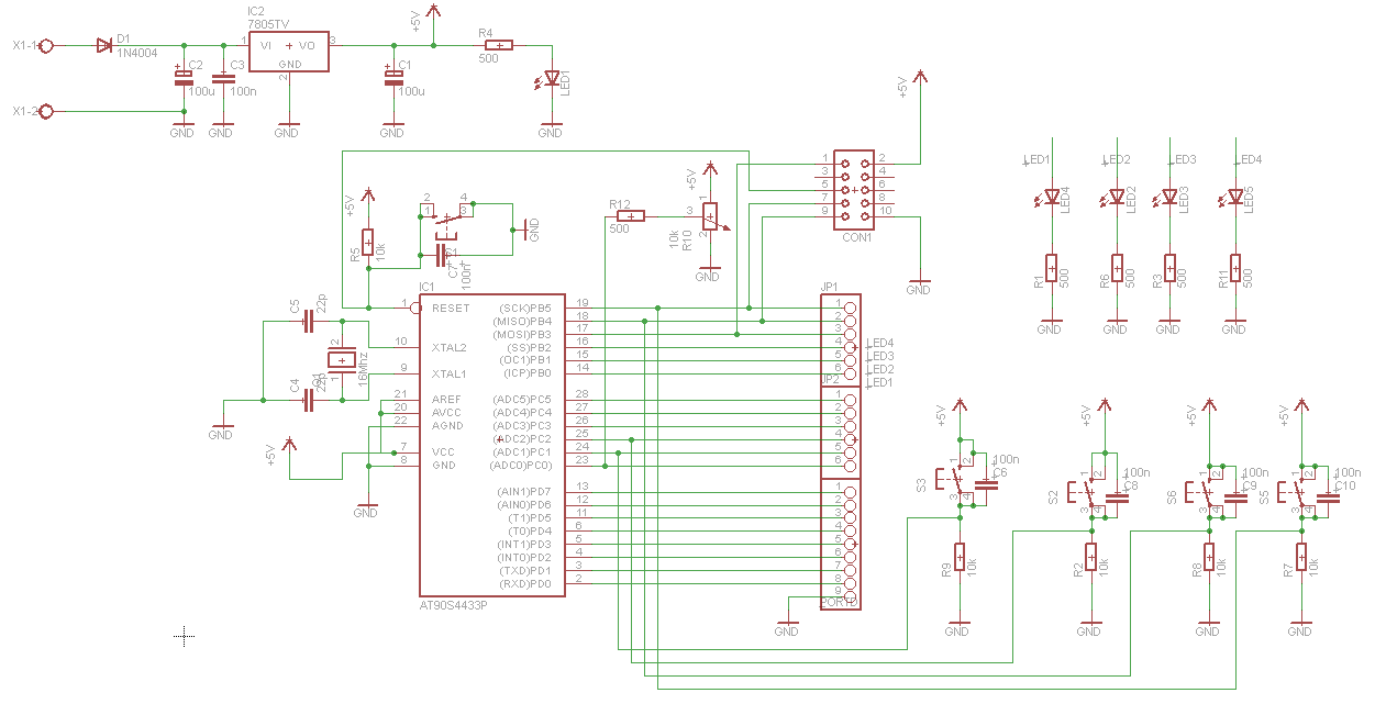 Építek 1 kapcsolást(kép), ahol USBASP programozóval programozom az atmega8ast. Kérdésem az volna, hogy összeköthetem-e a programozó 5V-ját amit a számítógép szolgáltat, a nyákon lévő 7805-el? Illetve melyek azok a lábak, amiket tápra kell húzni hogy működjön megfelelően a kapcsolás? Mert úgy csináltam, hogy AVCC és VCC egy tápon van.
