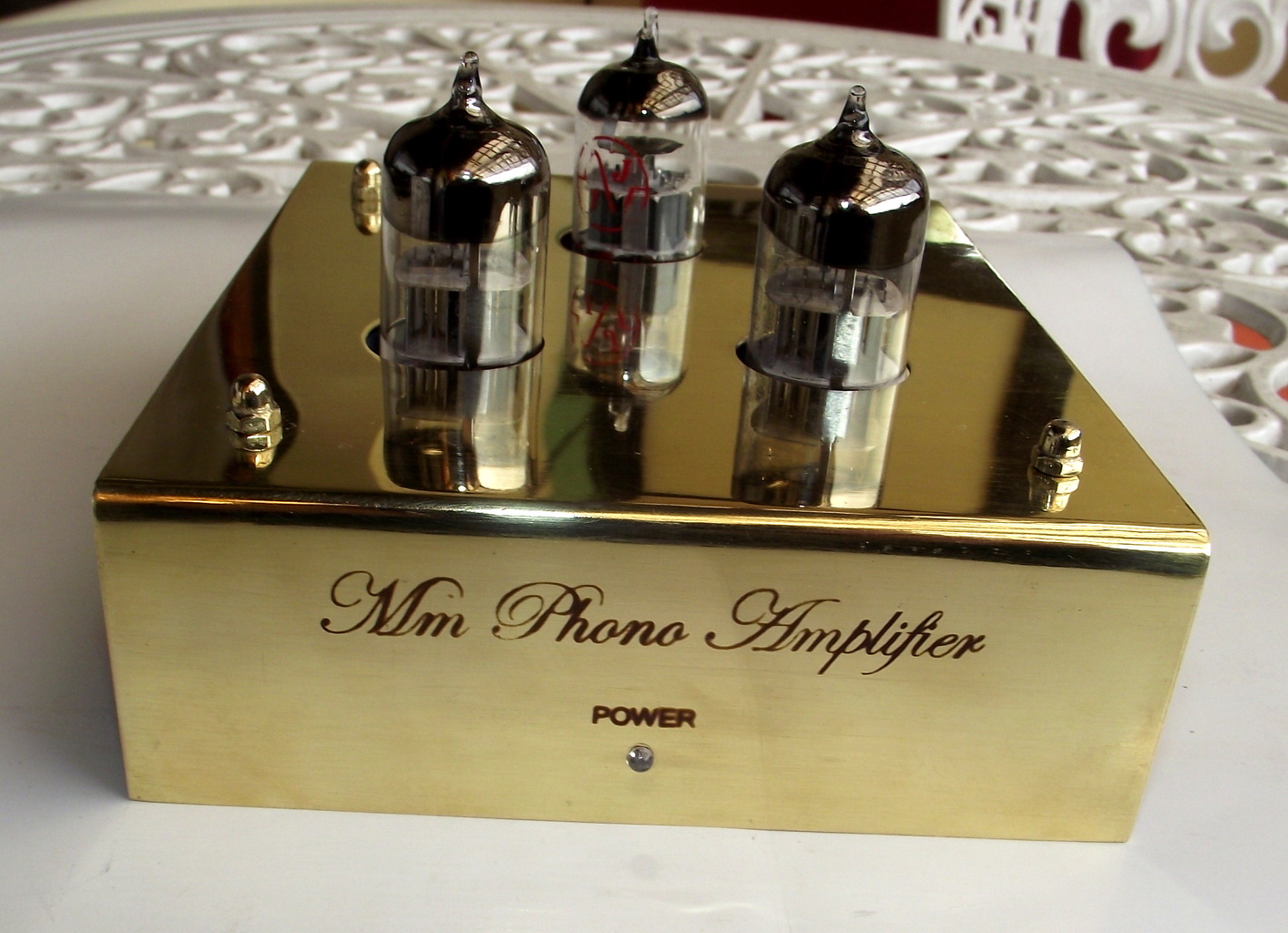 Egyszerű csöves RIAA, fa oldallapok és az alsó lemez még hiányzik, de már működik.