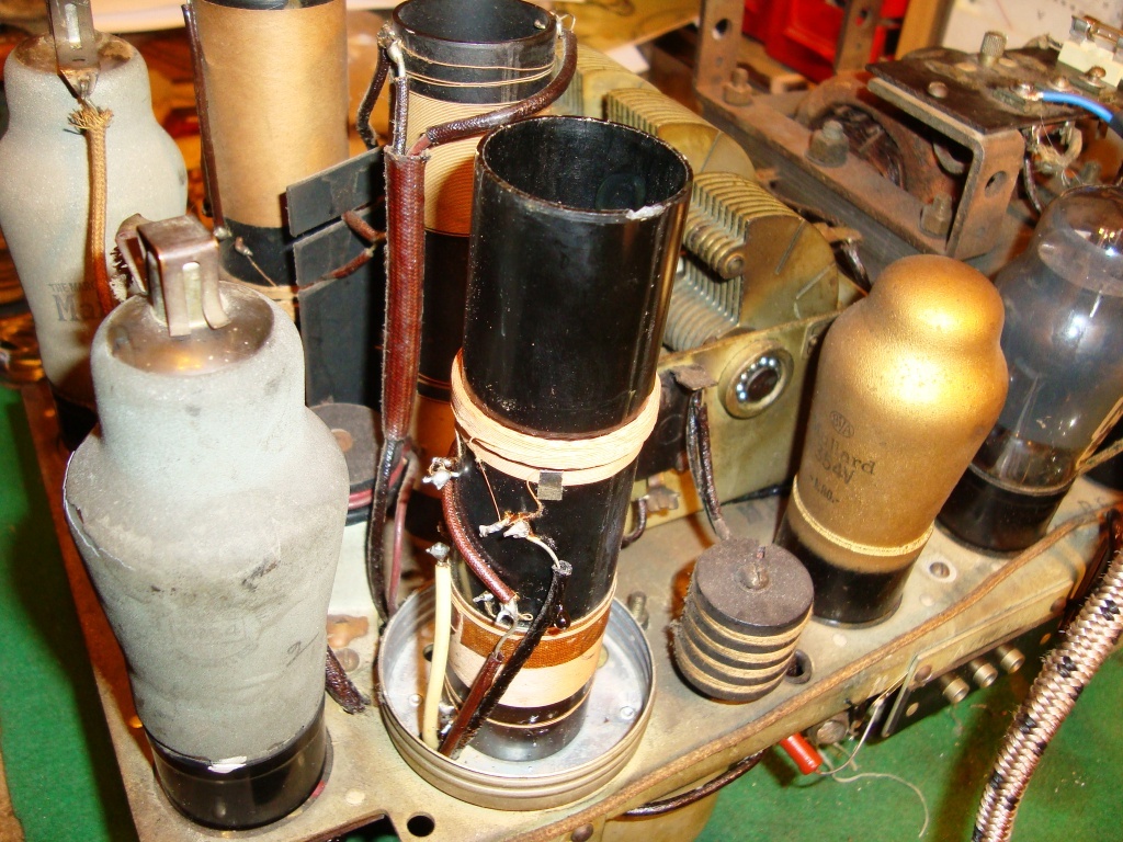 Folytatom a Marconit: Némi kinlódós hibakaresés után kiderült, hogy törött a hull váltó. Ki kellett szerelni az egyik KF-et, hogy valahogy hozzáférhető legyen, és egy régi telefonreléből csináltam bele új érintkezőt. Egyben rendbe kellett szedni a KF-et is, a hangoló trimmereket kellett javítani. A légmagos oszc. kör volt a következő hiba, itt hangolni kellett volna a tekercset, de nem mertem megmozdítani, mert féltem hogy a régi papír szétesik ezért beleépítettem a közepébe egy vasmagot, és azzal hangoltam. Ezzel lehetővé vált a magasfrekis rész beindítása, jó is lett. Az erős torzítást a végcső okozta. Be kellett állítani az előfeszt, a katódellenállással, kicserélni az átvezetős csatolókondit, és meg kellett emelni a segédrács feszt. ellenállás cserével. Ezzel el is múlt a torzítás. Ezen kívül javítottam még a gerjesztett hangszórót is. Tisztítás, beállítás után az elektromos rész most készen van, jöhet a gramafon. (Ez még nem lemezjátszó)