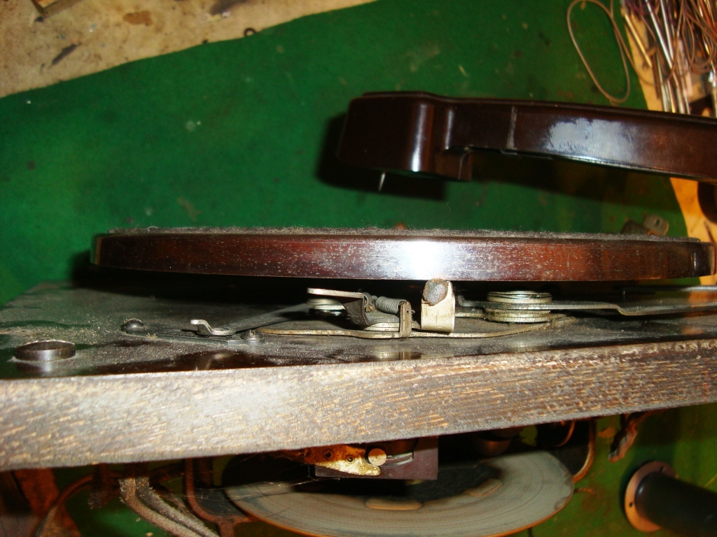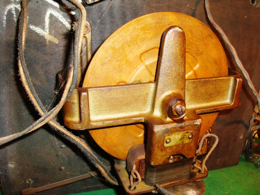 És folytatásként itt van a kiszerelt garamafon. Örvényáramú tárcsás meghajtó motorja van, mint a villanyóráknak csak minden nagyobb. A fordulatot röpsúlyos regulátorral lehet állítani. A fej hatalmas, és súlyos, meg régi cserélhető acéltű kell bele, és csak 78-as fordulaton jár. Kipróbálni még nem tudtam, mert törött a hál. kapcsolója. Egyébként külön hangerő szabályzóval csatlakozik a készülékhez.