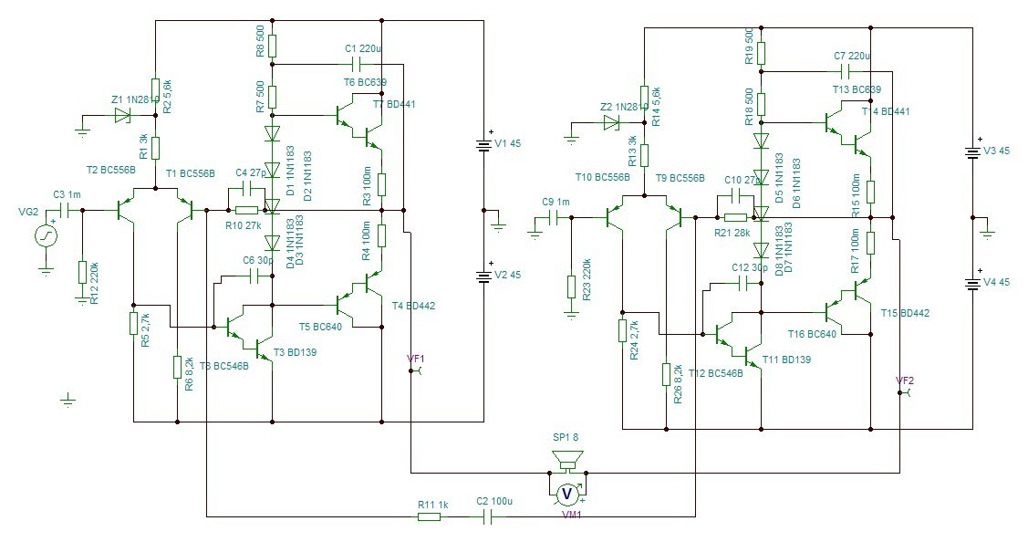 Ezen kívül a végtranzisztorok kicsik ekkora tápfeszültségre. Csak a hídkapcsolás szemléltetése miatt tettem be hídban, de ezekkel a végtranzisztorokkal csak +-25V tápfeszültségre lesz jó.