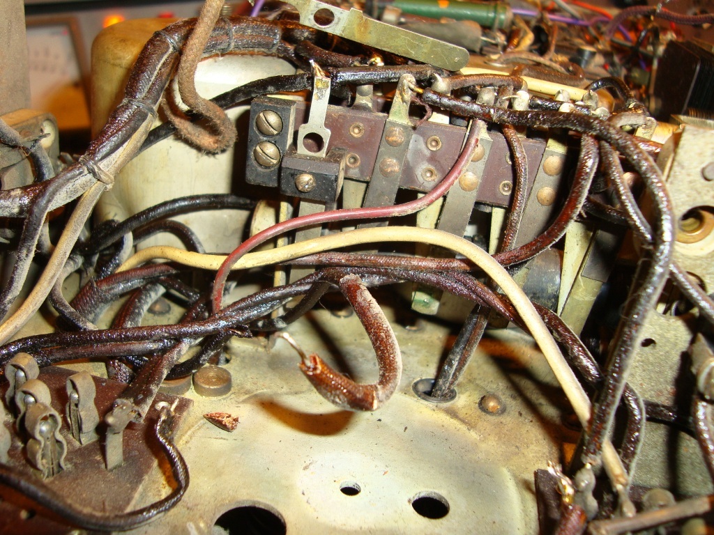 Folytatom a Marconit: Némi kinlódós hibakaresés után kiderült, hogy törött a hull váltó. Ki kellett szerelni az egyik KF-et, hogy valahogy hozzáférhető legyen, és egy régi telefonreléből csináltam bele új érintkezőt. Egyben rendbe kellett szedni a KF-et is, a hangoló trimmereket kellett javítani. A légmagos oszc. kör volt a következő hiba, itt hangolni kellett volna a tekercset, de nem mertem megmozdítani, mert féltem hogy a régi papír szétesik ezért beleépítettem a közepébe egy vasmagot, és azzal hangoltam. Ezzel lehetővé vált a magasfrekis rész beindítása, jó is lett. Az erős torzítást a végcső okozta. Be kellett állítani az előfeszt, a katódellenállással, kicserélni az átvezetős csatolókondit, és meg kellett emelni a segédrács feszt. ellenállás cserével. Ezzel el is múlt a torzítás. Ezen kívül javítottam még a gerjesztett hangszórót is. Tisztítás, beállítás után az elektromos rész most készen van, jöhet a gramafon. (Ez még nem lemezjátszó)