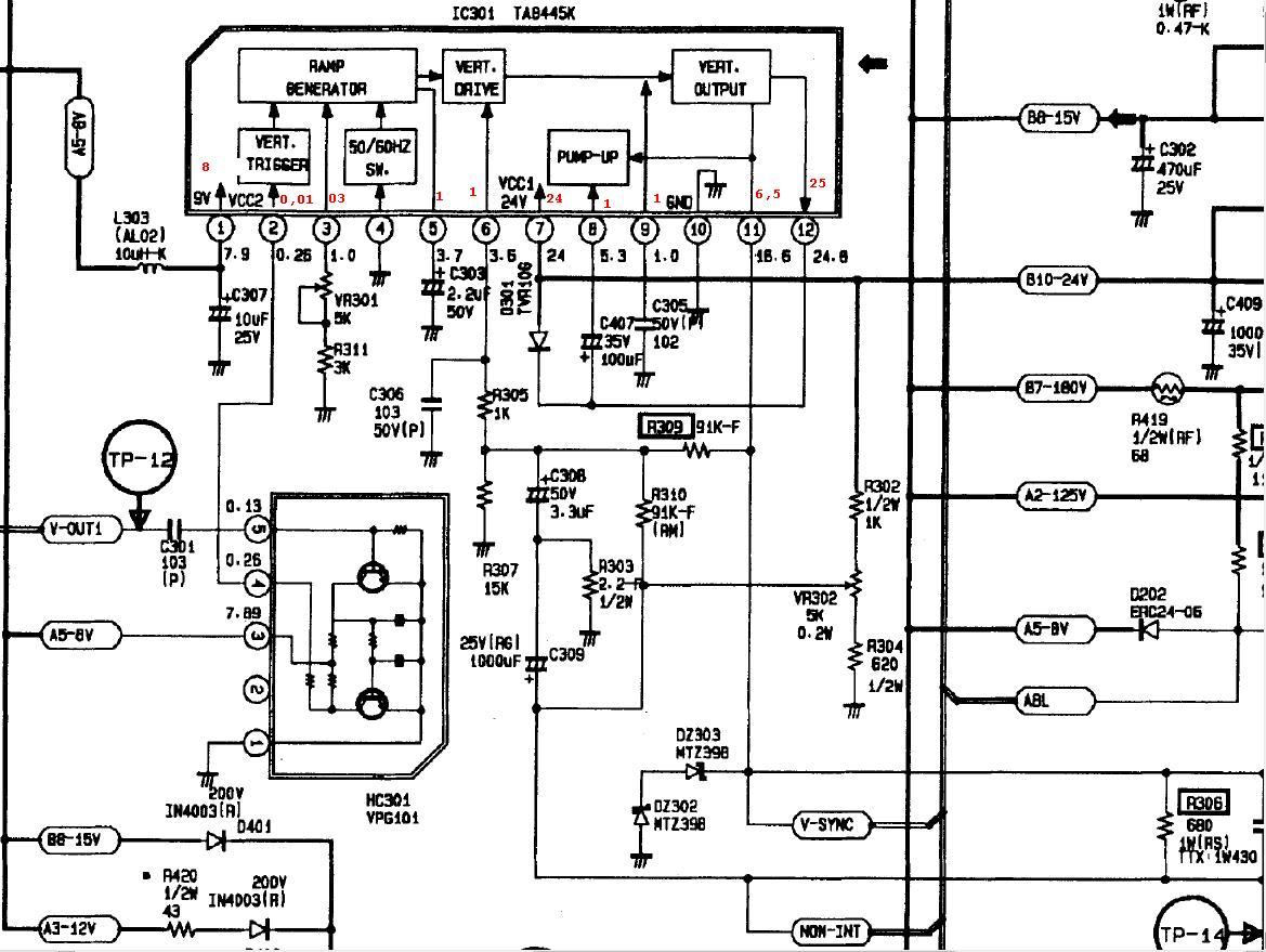 Tv-k terén nem vagyok egy zseni, ezért szeretnék segítséget kérni. Tegnap hajnalban felénk nagy vihar volt és kóbor villám járt egy barátomtól pár oszloppal arrébb. A TVben(Samsung CK-5073) elment a függőleges eltérítés. Csatoltam a tv rajzát, és amit mértem a függőleges végfokon. A VR301-el nem tudom az 1V-ot beállítani pár mV-ot változik csak. A 2,2uf kondi mintha már ki lett volna folyva, azt kicseréltem de hiába. Csak egy vízszintes csík van meg hang. a STB led is pislákol kicsit amikor be van kapcsolva a tv. Mintha mindig piros lenne és vibrál benne a zöld is. Mi lehet a baj? IC csere? köszi! A hozzászólás módosítva: Ápr 11, 2013