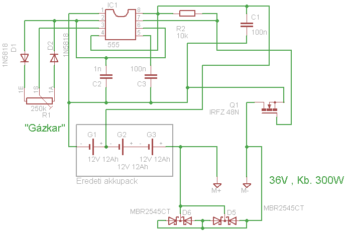 ![]() Mentem a biciglivel 5km-t, amikor elindultam teljesen lefogtuk a motort, kakaót adtunk a motorra, és egyrészt az elektronika is túlélte(nem tudom, egy 250W-os motor, vagy ez mennyi hány amper vesz fel rövidzárlatban, de szerintem 30-at tuti, majd megmérem), másrészt az akku is megtartotta a 36V feszültséget, holott 12Ah-s akkuk vannak benne. Az alul csatolt kapcsolást építettem meg, elhagytam a FET drivert. Bejött, az elektronika még mindig működik. Az akku töltésével picit gondban vagyok. Ilyen töltőt kaptunk a biciglihez, véletlenül fordítva adtam rá a tápfeszt az akku csatlakoztatására, és elszállt benne valami, alacsony frekin kapcsolgat csak a FET, annyira, hogy annyi impulzus szűrődik át, vagy öninduktivítás, hogy a trafó szekunderén lévő töltés jelző LEDet villogtatja, de semmilyen feszültséget nem tudok rajta mérni, és a rajta lévő elkót is majdnem felpuffadt.. Kicseréltem a FET-et, a kapcs. üzemű IC-t is, és a műv erősítőt is, diódákat átnéztem, de semmi. Úgy döntöttem, hogy termelek kicsit a magyar gazdaságnak , és vettem 2 db Makrai elektronik magyar cég által gyártott trafót.A 47V meg is volt üresjáratban, greatzel egyenirányítva, és 10.000µF-s kondival pufferelve, de ahogy csatlakoztattam az akkut, le is ment a töltőfesz 36V-ra, ami jó, mert nem halott az akku. ![]() 20 óra múlva elérte a 42V-ot, de már csak 400-300mA volt a töltőáram, az elején 800mA volt. Egy kérdés: Ezek a kínai akkutöltők hogy működnek? Érthető a töltőáram csökkenés, az akku belső ellenállása azthiszem nő, de ilyenkor a kinai töltők tartják az állandó töltőáramot? Az enyémben van egy 5W-os ellenállás sorba az akkuval, gondolom a műv erősítő figyelte, hogy ezen a feszültségesés mindig állandó maradjon. Jól gondolom? ![]() ..mert akkor készítek egy kisebb fajta ilyesmi elektronikát, hogy ezt a feladatot elvégezze. Az automata kikapcsolás nem lesz gond. Végezetül: Ahhoz képest, hogy levágott vezetékekkel, és PWM nélkül kaptuk ez a bringát ingyé, szerencsére jó állapotú akkuval, és motorral, egész szépen sikerült felújítani 15 db ezresből. A hozzászólás módosítva: Márc 31, 2013