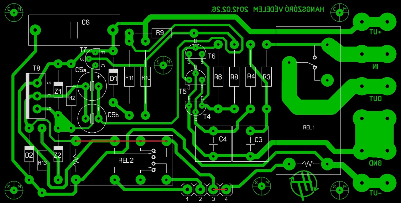 Reloop topictárs segített a hiba felderítésében, köszönet neki. Én dual-mono felépítésű erősítőben használom, ezért kétszer van megépítve a védelem. A mellékelt terv az egyik oldal, logikusan. Terveztem bele egy kis trükköt, amivel galvanikus kapcsolat nélkül össze lehet drótozni a két oldalt, hogy pontosan egyszerre kapcsoljanak. Ezért van benne egy második relé és tüskesor. Ha ezt nem akarod használni, a pirossal jelölt átkötéseket építsd be, és nem kell a plusz relé.