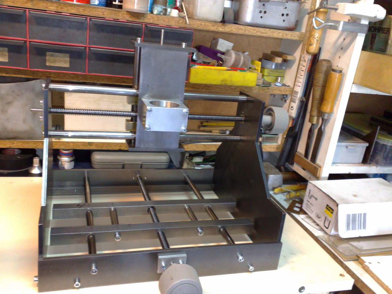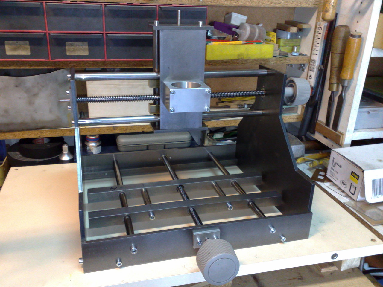 Natúr faforgácslap.... Ez is a maga alá "szemetelő" konstrukció? Meg fog vele gyűlni a bajod, hogy a forgács mindig az Y tengelyre hullik - vagy porszívó... Amúgy betonstabilnak tűnik. A kézikerék szerintem túl nagy - mindig bele fogsz akadni... Ráadásul igen ritkán használja az ember.