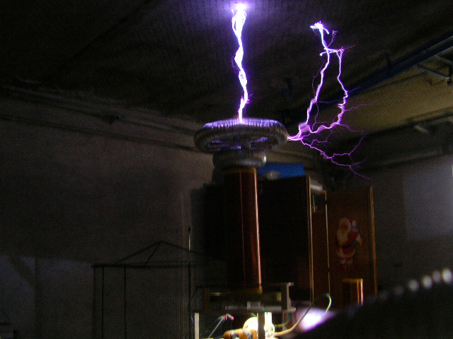 Tegnap kint este kipróbáltuk a teslát a nagyobbik tetőkapacitással, meg is lett az eredménye, az új szikrahossz 1,6 méter, amit folyamatosan elért (kitörési pont nélkül) és kb 1,8 méteresre becsülöm az abszolút maximális szikrahosszt így. Elég jól néz ki, mikor a toroidon körbe elindul a szikra, és majdnem hogy körbe megy rajta. KÉP Letölthető videó