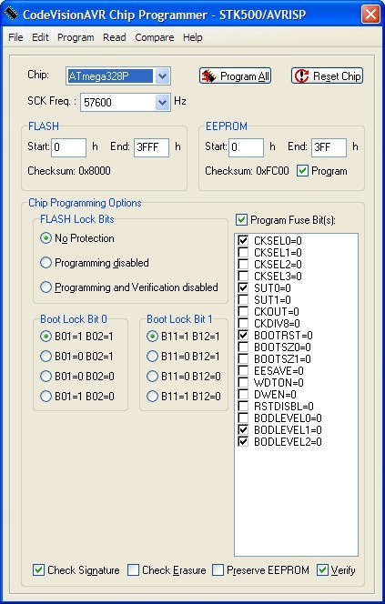 Köszi, de az "AVR Burn-o mat" csupán a kezelősegítség a winavr-nek, aminek giveio.sys meg mindennel nyűgje van. A portot nem ismeri fel. A bascom-al minden klassz, csak ott meg a biztosítékbitek nem úgy vannak nevezve, hogy be tudjam állítani elcseszés nélkül. Avr studio usb-s. A Pony nem ismeri a 328-as csippet. Esetleg valakinek van ötlete, hogy mivel lehetne beírni egy Atmega328-ba ezzel az 5 szál dróttal LPT-n a progit az Atmega8-ashoz hasonlóan? Low:0xF7, High:0xD9, Ex: 0xFC vagy más néven CKSEL3, SPIEN, BOOTSZ0, BOOTSZ1 kipipa.