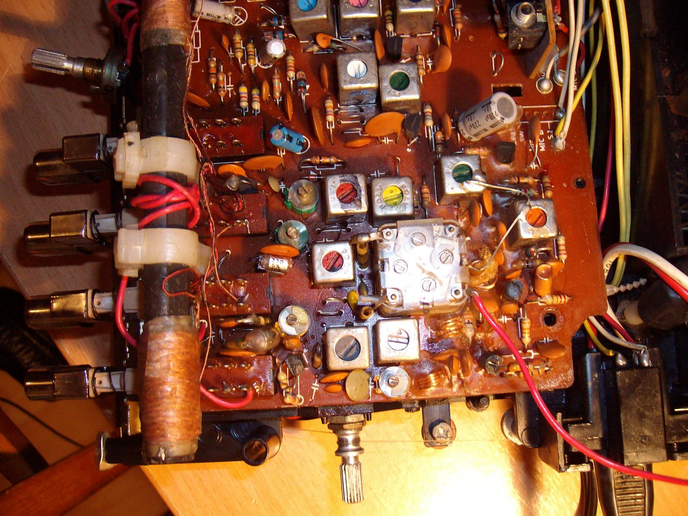 Levettem a forgóról a két kondit, részben vissza is állt a skála a rendes helyére. Most a 88,7-nél levő adót már jó térerővel fogja (bár a skálán már bőven 89,5-nél van ekkor), fent viszont (108-ig van skálázva!) kb. 103 MHz-nél ér véget, az utolsó adó 102,8-nál van. Azon a képen is látszik valamennyire, amit feltettem, hogy a forgó tövében levő kis légmagos tekercsen a viasz már nem épp sértetlen, ez lesz az a tekercs, amit újra össze kéne nyomni?