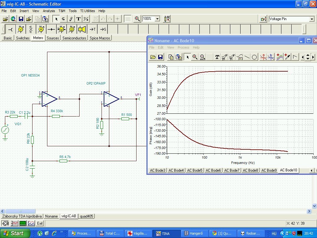 Csakhogy ez egy zérus, azaz ettől a kiadódó frekvenciától kezd el nőni az erősítés, mégpedig 20dB/dekád meredekséggel. Addig nő, amíg el nem éri a a 330k/22k által beállított erősítést és ez viszont 20Hz fölé adódik ki. Tehát ahhoz, hogy a kapcsolás a 47nF nélkül átvigyen 20Hz ig, hatalmas kondenzátor kellene, ami persze nagyfrekvenciásan nem eléggé hidegít ( eléggé jó pedig nem létezett a kapcsolás tervezése idejében). A másik megoldás pedig a 4,7k emelése lett volna, csakhogy akkor meg az offszet elmászik. Ezért a Quad zseniális tervezője azt választotta, hogy 330k/22k -val beállított erősítést adó tagokat kiegészíti egy mélyt emelő kondenzátorral, nos ez lett a 47n. Nagyobb kondenzátor alacsonyabb frekvenciájú töréspontot ad ehhez a mély emeléshez, tehát kisebb lesz a mély emelés, azaz nem kompenzálódik a relatív kisebb értékű 100µF-os hidegítő kondenzátor mély vágó hatása. Az időállandókat úgy választotta meg, hogy kis impedanciás generátorról lineáris legyen a frekvencia menet 20Hz-ig. ( ugye a 405-ös elé járt egy előerősítő, ami tudta ezt) Az ábrán látható a szimuláció eredménye 680nF-al, látható a durva mélyvágás, tehát hagyjuk meg a 47nF-ot. A másik ábrán a Quad átvitele látható, de most a mély emelő kondi nélkül, látható, hogy a mély emelő kondi nélkül vágja a mélyeket. A hozzászólás módosítva: Ápr 27, 2013