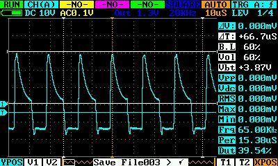 A gate meghajtás stimmel, szerintem ezután az áram vcs-t kéne ellenőrizni, kéne adni az IC kimenetéről egy emmiterkövetővel&/RC taggal jelet az áramváltót lezáró ellenállásra, azthiszem a 33ohm-os az. Fontos hogy ne négyszöget kapjon, hanem egy négyszögre szuperponálódott fűrészjelet, majd holnap kigondolom pontosabban. Így tudod majd szabályozni a kitöltési tényezőt, és ha egy apróbb táppal meghajtod a teljesítmény részt, akkor végig tudod mérni, azt is, hogy a kitöltési tényező változtatásra hogyab reagál, ha lesz hiba még valahol, akkor remélhetőleg látszódni fog. Az RC tagot kikötve, kis betáp mellett még rövidre is zárhatod a kimenetet egy közepes vezetékdarabbal, akkor lehet majd látni hogy avatkozik be az áram szabályozás. Ha ezután is minden stimmel, akkor kaphat egy izzót, aztán meg kell próbálni élesben, kis árammal...