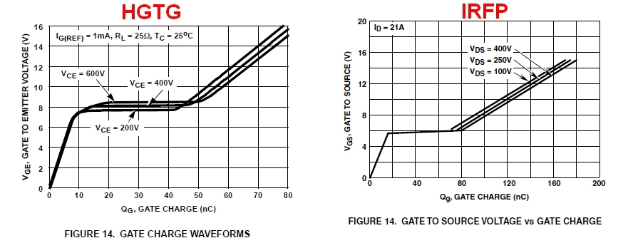 Csatolok egy ominózus ábrát egy IGBT és egy FET adatlapjából. Ezen jól látszik, hogy amíg a FET bekapcsolásához még éppen elég a 3845 7,6V-ja, addig az IGBT-hez már egyáltalán nem. A töltés feszültségének mindenképpen a miller plató fölé kell menni, hogy mennyivel arra talán katt konkrétabb választ tudna adni, én sohasem kísérleteztem ezzel. Úgy szoktam a gyakorlatban csinálni, hogy a FET-nek minimum 9-10V körüli gate feszt adok, az IGBT-nek pedig 12-13V-ot.