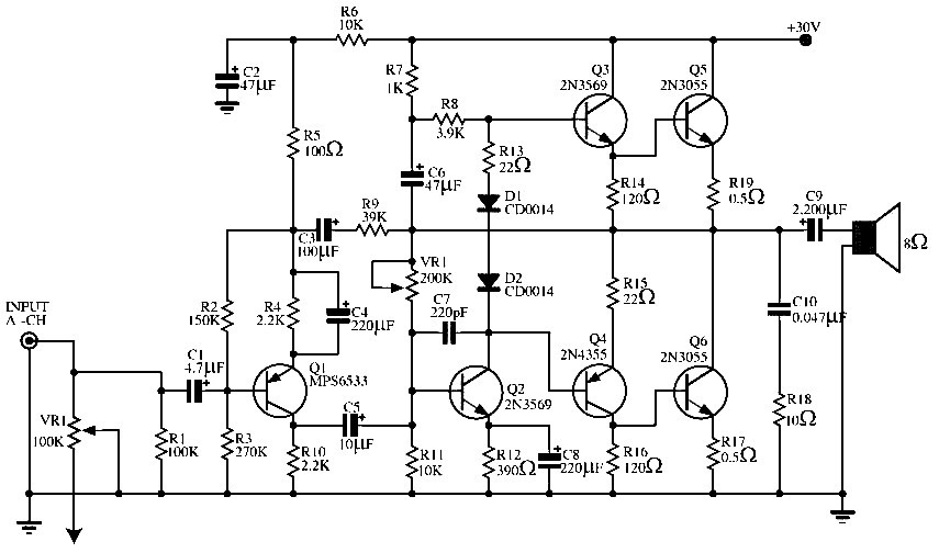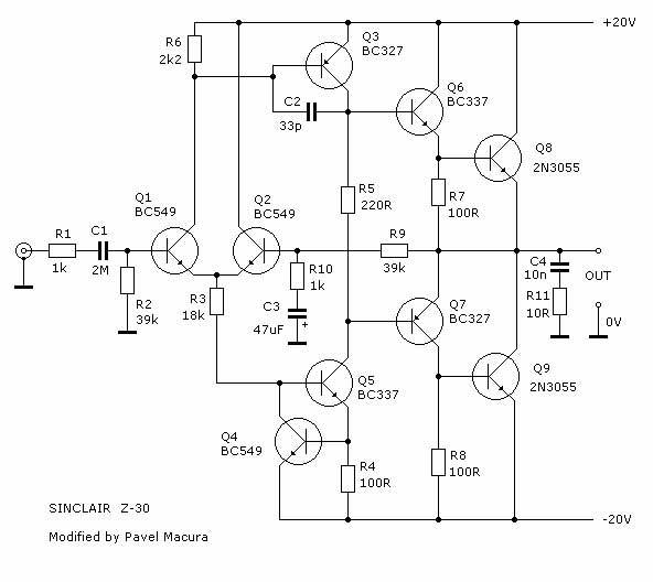 Sziasztok! Valaki feltenne egy egyszeru erosito kapcsolasi rajzot, ami mukodik +/-30V-es 2 NPN vegtranzisztorja van.[2n3055]