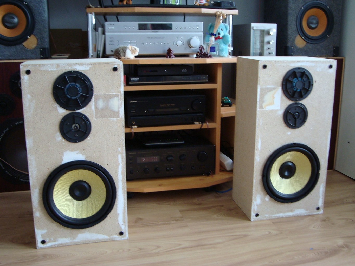 Hétvégi alkotás. Még nincs kész, mert kellene rá valami bevonat, de ezen kívül megvan. Egy videoton DC 2550 doboza volt az alany. A hangszórók nem voltak benne, azért másmilyenek vannak benne. Valaki nem bánt vele tisztességesen, és szét fúrkálta, meg meglocsolta. Ezek lettek javítva. Esetleges ötleteket is jöhetnek a burkolatra.