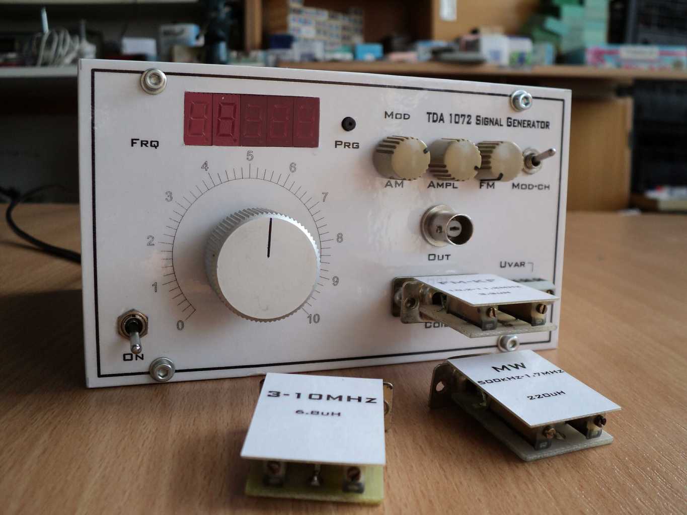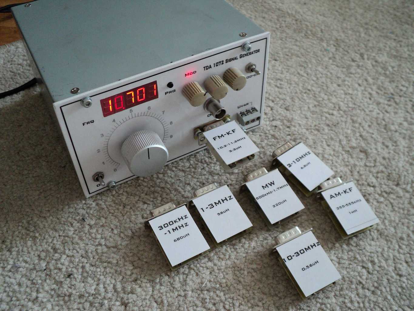 Üdv, készült egy szignálgenerátor. Az alapja a TDA1072-es IC-ben rejlő lokáloszcillátor. 22kHz-től kb 60MHz-ig működik, a tartományokat az előlapi csatlakozóra helyezett tekercsekkel lehet választani. Itt van még két trimmer, azzal a frekvenciahatárokat lehet pontosítani, vagy a sávot széthúzni. Az amplitúdómodulációt egy MC1496-os intézi, ezzel történik a kimeneti szint szabályzása is.