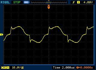 Szerintem, nagy a dU/dt a fet kikapcsolása után. Az induktív áram hamar áttölti a feteket +300V-ra, Amíg pozitív az áram addig 300V-on maradhat utána pedig már elkezd negatív irányú lenni ami szépen elkezdi csökkenteni a félhíd feszültségét és csak ez után kapcsol be a felső fet.