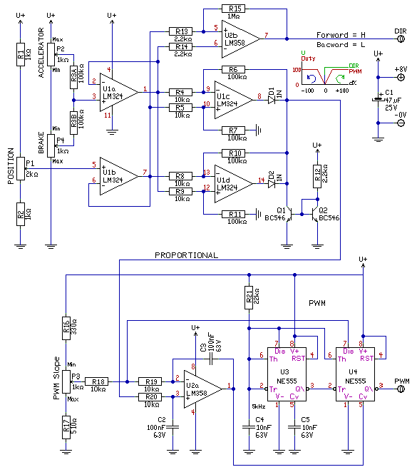 - Először is ez nem komparátor, hanem pozíciószabályozás. - Másodszor szerintem hibás a kiindulási elmélet. Az erőt nem a gázpedál állása adja, hanem gyorsulás-lassulás mértéke. Vagy is az erő a gyorsulással arányos, nem a fordulattal vagy a gázpedál állásával. Mikor megnyomod a gázpedált, a kocsi gyorsulni kezd, és a tehetetlenségi nyomaték az ülésbe nyom. (Amúgy nem az ülés nyomja a hátadat előre..) De mihelyt a kocsi sebessége állandósul, a nyomaték megszűnik. Ha leveszed a gázról a lábad, sokkal kisebb a lassulási nyomaték. Mikor fékezel előre esel, de mihelyt megáll a kocsi, megszűnik az erő. Ha meg leveszed a lábad a fékről, nem kezd el gyorsulni a kocsi, hanem nem lassul tovább. Szóval részemről az egész, inkább egy kondi töltő-kisütő áramához (differenciáló áramkörhöz) hasonlít, mint a pedálok és a helyzetbeli különbségéhez.. Készítettem már hasonló áramkört, most átrajzoltam szerintem hogy lehet megoldani pld. analóg módon. Mert lehet ez inkább programozási feladat, mint áramköri. Itt két kimenet van, egy DIR irány kimenet, ami mutatja merre forog a motor, és egy PWM kimenet, aminek impulzus szélessége arányos az eltéréssel. Ha a differencia megszűnik, a PWM nulla lesz, vagy is áll a motor. A szabályozást a két érték összehasonlításával is meg lehet oldani (komparátor), de akkor holtzónát kell kialakítani az egyenlő állás esetén. Hogy a motor ekkor ne ide-oda rángasson. Viszont a kétállású szabályzás sokkal durvább, és a mechanikának tehetetlensége is van, amitől túl fog futni. (Egyébként a videón is látható olyan mozgás, ami a motorhanghoz semmi köze nincs. Figyeld meg például amikor vált. Szóval "ez még itt nem a NASA!") De a H-hid problémát majd megoldják azok, akik ezzel foglalkoznak a topikban. Az áramkör 8V stabil feszültségről működik, nem 5V-ról, mert az egyszerű lelkületű erősítők ezzel elboldogulnak. üdv!