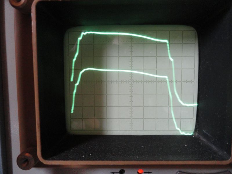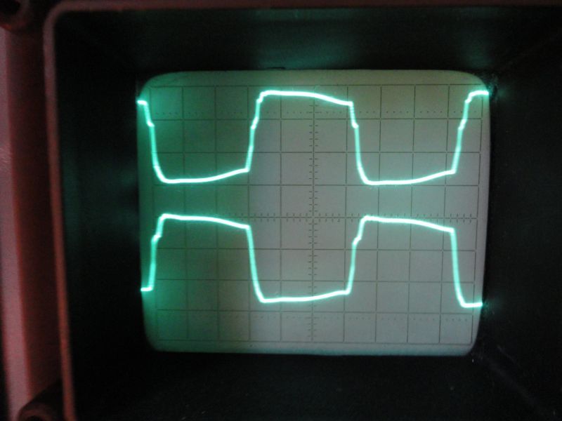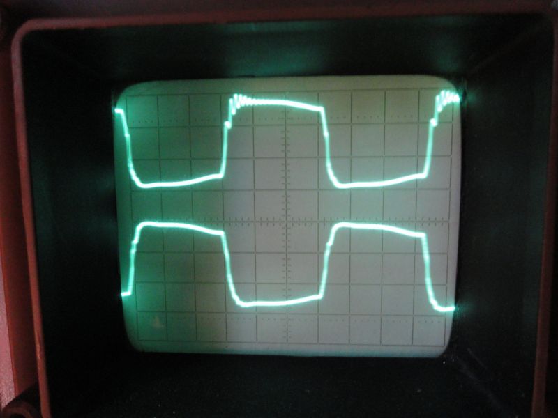 Még mindig a teljes hidas géppel szórakozok. Próbáltam több gate meghajtó trafót és több fajta IGBT-t is. A problémám (most), hogy ha nézem a jelalakokat az IGBT gate oldalán az ellenállás után 3 db egyforma, a negyediken nagy brumm látszik (csak a meghajtás 12 V-os feszültsége van rajata). A másik, hogy ugyan az 5 tekercs menetszáma egyforma, a gate meghajtások feszültsége lényegesen magasabb, mint a primeré (12 V primer, kb. 20 V szekunder). A szkóp ábrák 5 V/div állásban mutatják a feszültséget, a frekvencia 64 kHz.