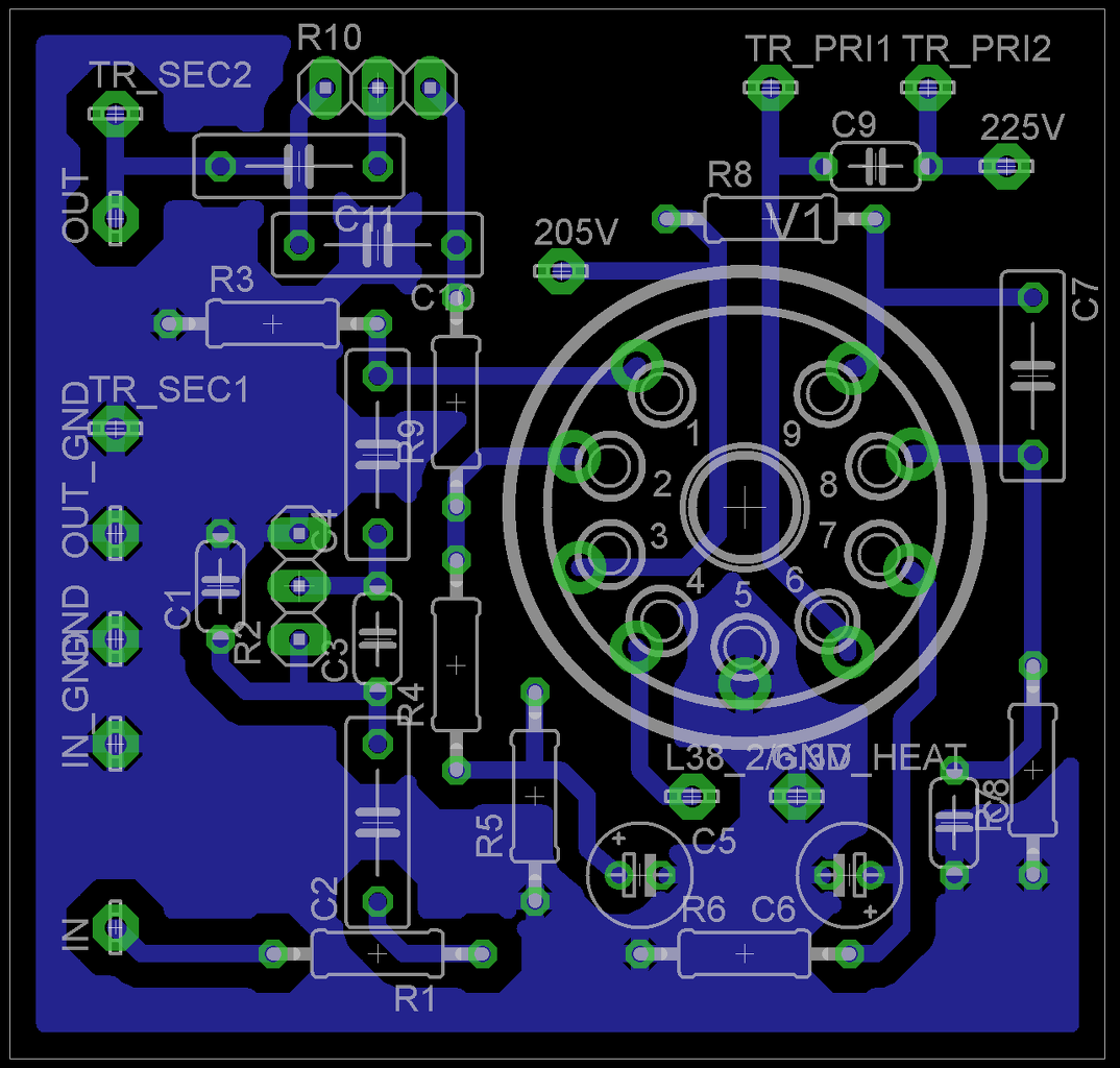 Hello! Én a C9 méretét kicsinek találom.. Az erősítőnél, a GND pontokat nem vinném olyan közel az anódlábhoz. Ugyan így a tápegység résznél, a GND kitöltést feleslegesnek találom. Minek kihívni a sorsot magunk ellen. A 250V egyen, minden piszkot magához fog vonzani, és idővel átüt. Inkább a kondihoz menő plusz vezetékeket vastagítsd meg. üdv!