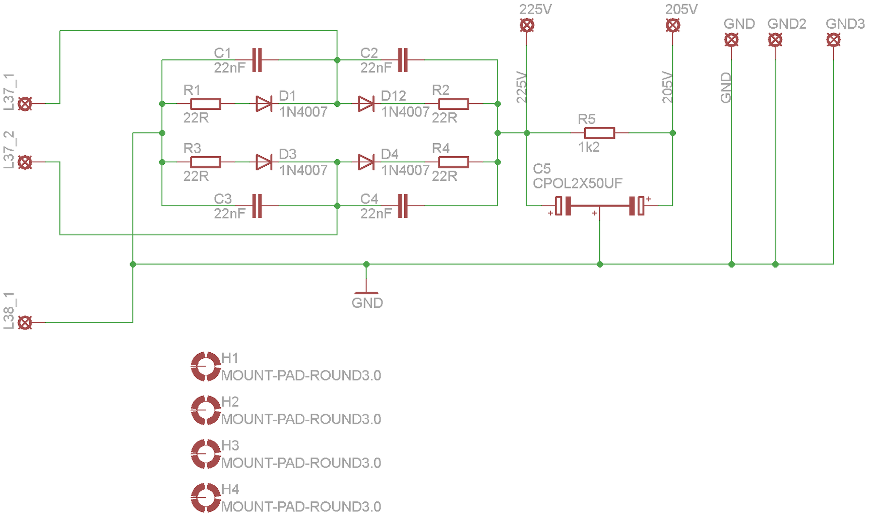 A 230V-ra tennék egy biztosítékot. Jólenne egy méret jelölés, így ránézésre a hálózati feszültség csatlakozási pontjai elég közel vannak egymáshoz. A felső 2 dióda bal oldala közvetlen összeköthető, így nem kell a hosszú összekötés.