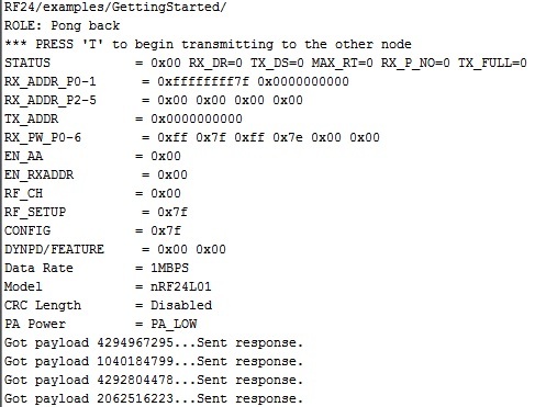 Próbáltam már nrf24_ping_client/server-rel is, de nem "látják" egymást. Mirf library-val is próbálkoztam, ott sincs eredmény. RF24Master-t is betöltöttem, azon belül a "GettingStarted" példát, de valami nem jó, ezt írja ki soros monitorozásnál(melléklet): Ha pedig átváltok a "T" -t beírva transmitting módba, ezt kapom: *** CHANGING TO TRANSMIT ROLE -- PRESS 'R' TO SWITCH BACK Now sending 314153...ok...Got response 4294967295, round-trip delay: 314159 Now sending 315166...ok...Got response 4294967295, round-trip delay: 315169