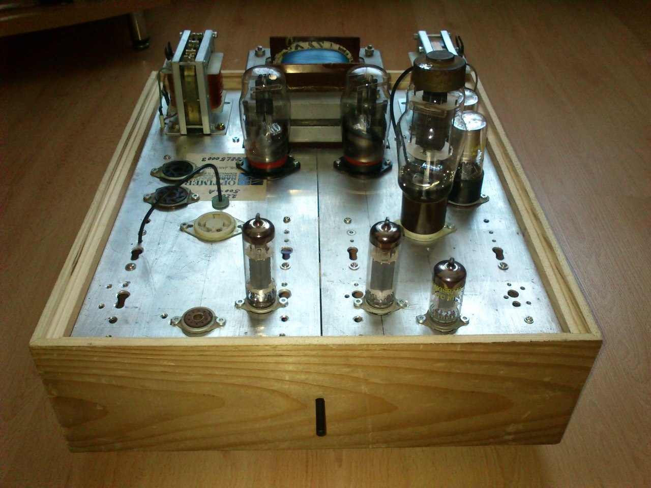 A mai nap kész lettem egy 807 SE erősítővel. Pár kép róla és kapcsolási rajz. Szólni szól, de nem tudom teljesen kihajtani mert nincs olyan jelforrásom ami kiad 1,7V-ot. A discman és a számítógép csak 300mV-ot ad ki. A 807-es meghajtó csöve egy ECC81-es. Csak az egyik fele van használva.