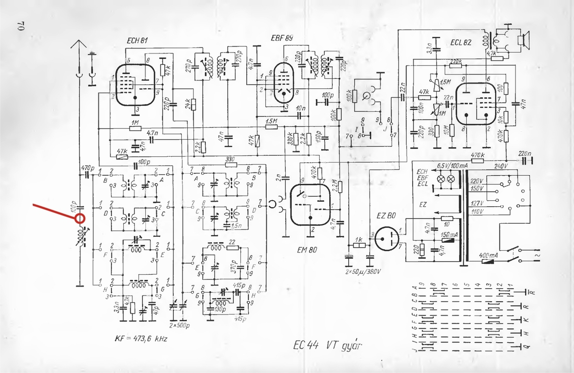 A jelölt pont az antennakör KF szívó komplexuma(a 100pF+a vele soros tekercs), azért van, hogy a KF freki ne jusson ki az antennára. Ha a készülékben benne vannak, akkor az antennacsatlakozó közelében kell lennie, ha hiányzik, ma már az sem nagy baj, akkor okozhat zavart, ha a közelben más is pont a "Kossuth"-ot hallgatja KH.-n.