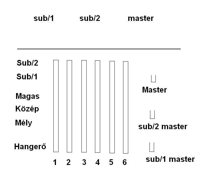 Bal oldalt vannak felírva, h sávonként mit szabályzunk. Tehát: Sávonkénti hangerő, mély, közép, magas, kontroll 1 kimenetre mennyi mennyen, én kontroll 2 kimenetre mennyi jusson. Aztán vannak a master szabályzók, ettől jobbra. A kontroll/1 hangfalra master-ben mennyi mennyen, kontroll/2 hangfalra master-ben mennyi mennyen, és végül az egész, a nagyhangfalra mennyi mennyen. Felül pedig a kimeneteket látni.